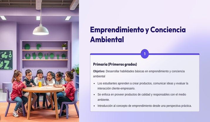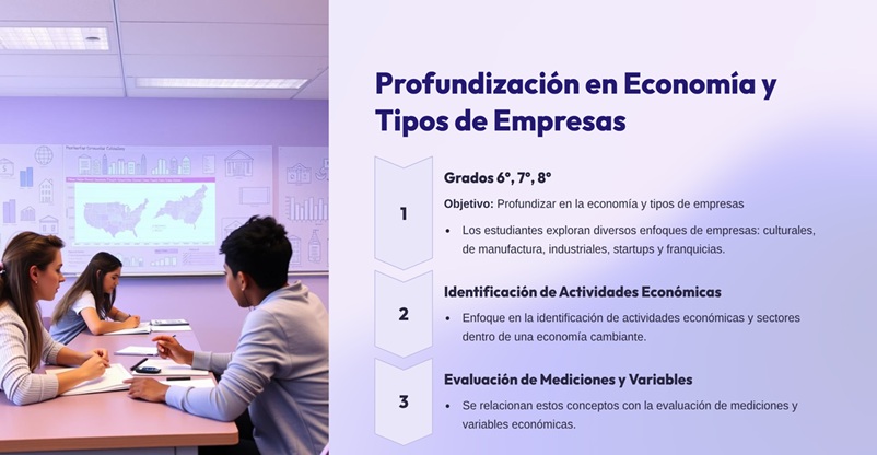 Desde los primeros grados, los estudiantes aprenden a crear productos, comunicar ideas, evaluar la interacción cliente-empresario, y proveer productos de calidad y responsables con el medio ambiente, entre otros. A medida que avanzan a los grados, los estudiantes profundizan en la economía y en diversos enfoques de tipos de empresas, como: empresas culturales, de manufactura, industriales, startups y franquicias. Todo esto enfocado en la identificación de actividades económicas y sectores inmersos en una economía cambiante de mercado, relacionado directamente con la evaluación de distintas mediciones o variables económicas.