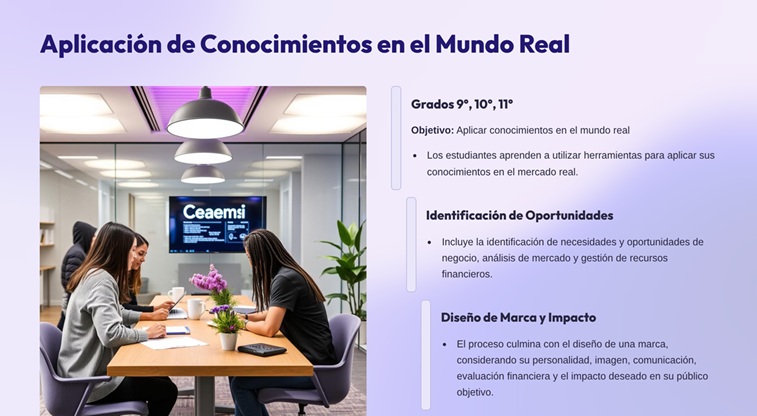 La enseñanza va más allá de los aspectos financieros tradicionales y se enfoca en experiencias vivenciales, formando emprendimientos y creación de empresas, partiendo desde los gustos y habilidades de cada uno de los estudiantes, así como de sus contextos y vivencias personales, donde identifican una necesidad o problema a resolver. De esta manera, se vuelca el protagonismo a los estudiantes y se le invita a aportar soluciones que pueden impactar tanto en el beneficio personal como en el de la comunidad; desde la perspectiva del aporte a los Objetivos de Desarrollo Sostenible.